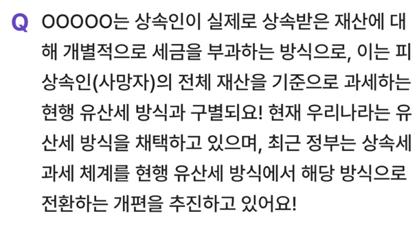 🔹 Q. OOOOO는 상속인이 실제로 상속받은 재산에 대해 개별적으로 세금을 부과하는 방식으로, 이는 피상속인(사망자)의 전체 재산을 기준으로 과세하는 현행 유산세 방식과 구별돼요! 현재 우리나라는 유산세 방식을 채택하고 있으며, 최근 정부는 상속세 과세 체계를 현행 유산세 방식에서 해당 방식으로 전환하는 개편을 추진하고 있어요!
