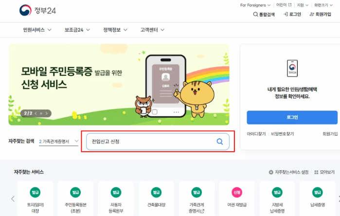 - 정부24 접속 → 전입신고 신청