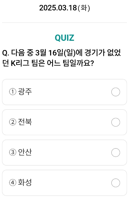 오늘(3월 18일)의 문제는 K리그 경기 일정과 관련된 퀴즈입니다. 정답을 확인하고 참여하세요! ⚽🔥